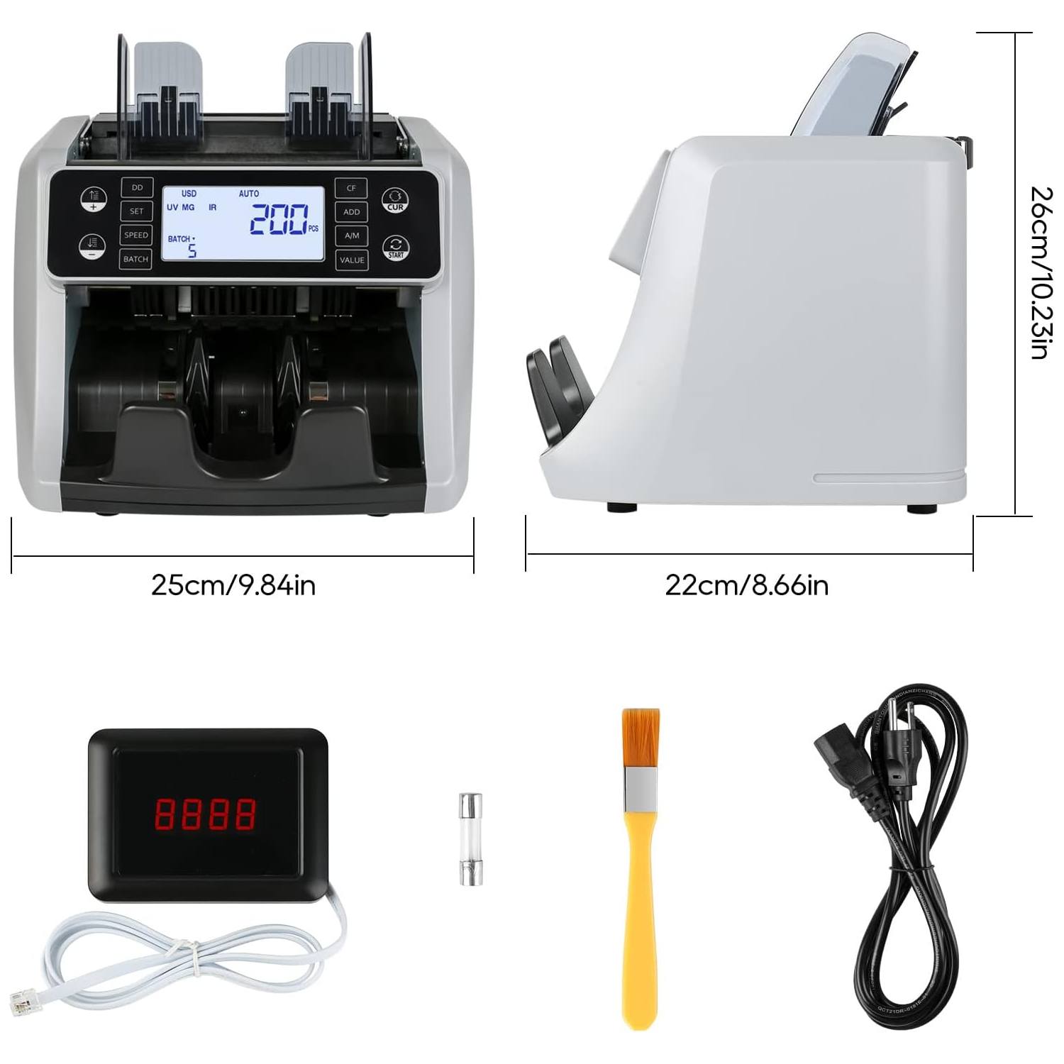 - Altamente Eficiente e Inteligente: Máquina contadora de billetes con funciones de lote, suma y autotest, arranque, parada y borrado automáticos/manuales. Puede elegir entre velocidades de recuento de 800/1000/1200 billetes por minuto.