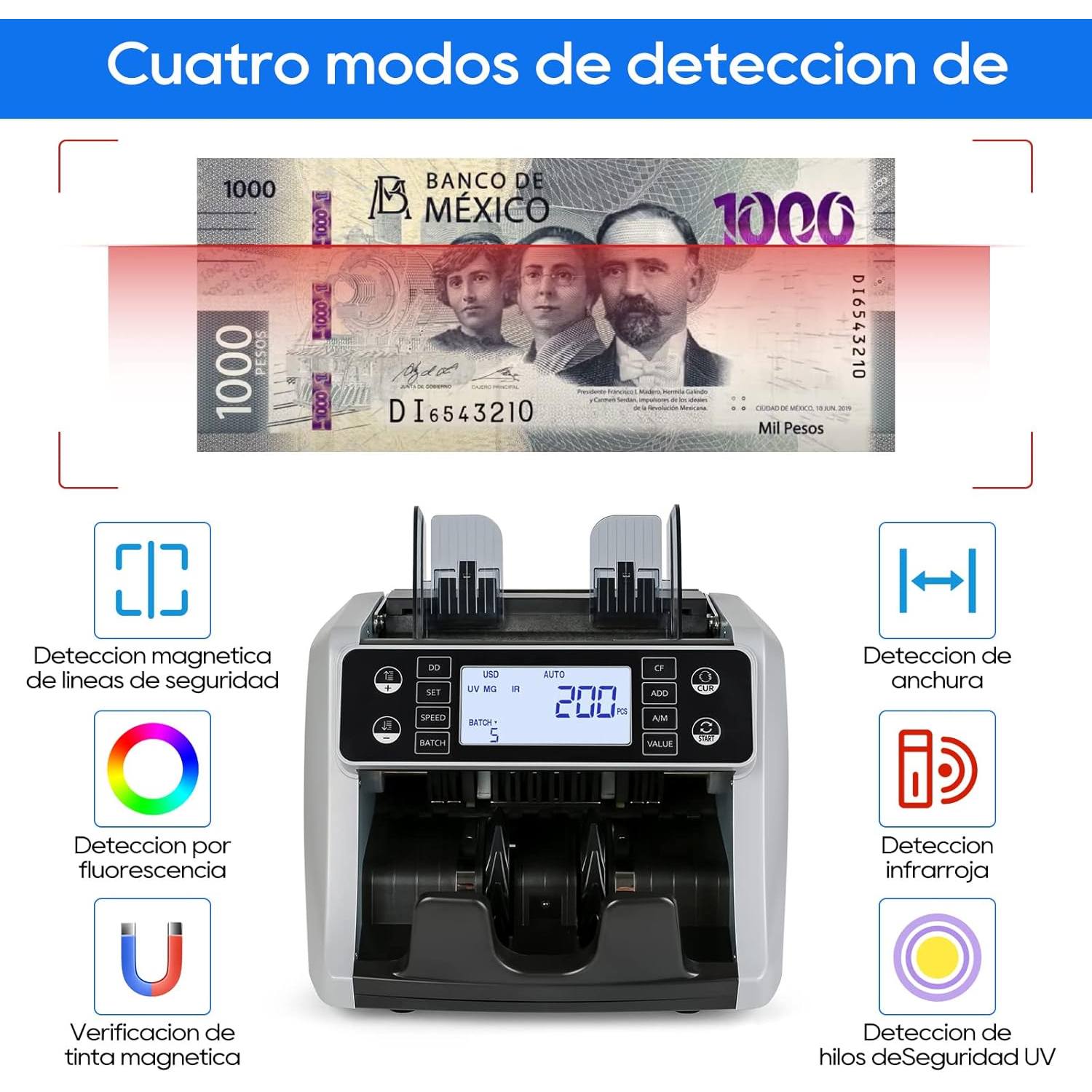 CONTADOR DE BILLETES CON DETECTOR DE BILLETES FALSOS, VELOCIDAD DE RECUENTO AJUSTABLE, HASTA 1200 HOJAS/MIN, CONTADORA DE BILLETES MULTIDIVISA PARA USO COMERCIAL