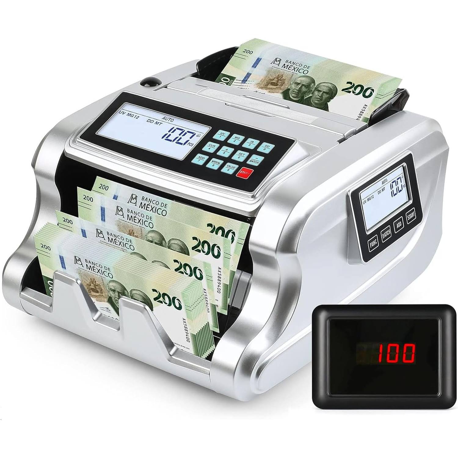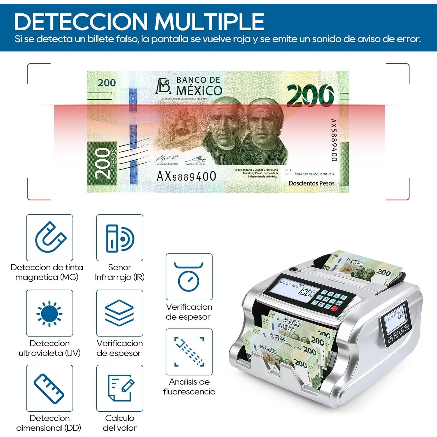 CONTADORA DE BILLETES MEXICANOS, DETECTOR DE BILLETES FALSOS CON TRES PANTALLAS LED, VELOCIDAD DE CONTEO 1000PCS/MIN, DISPONIBLE EN MONEDA MEXICANA, ESTADOUNIDENSE, EURO Y OTRAS DIVISAS