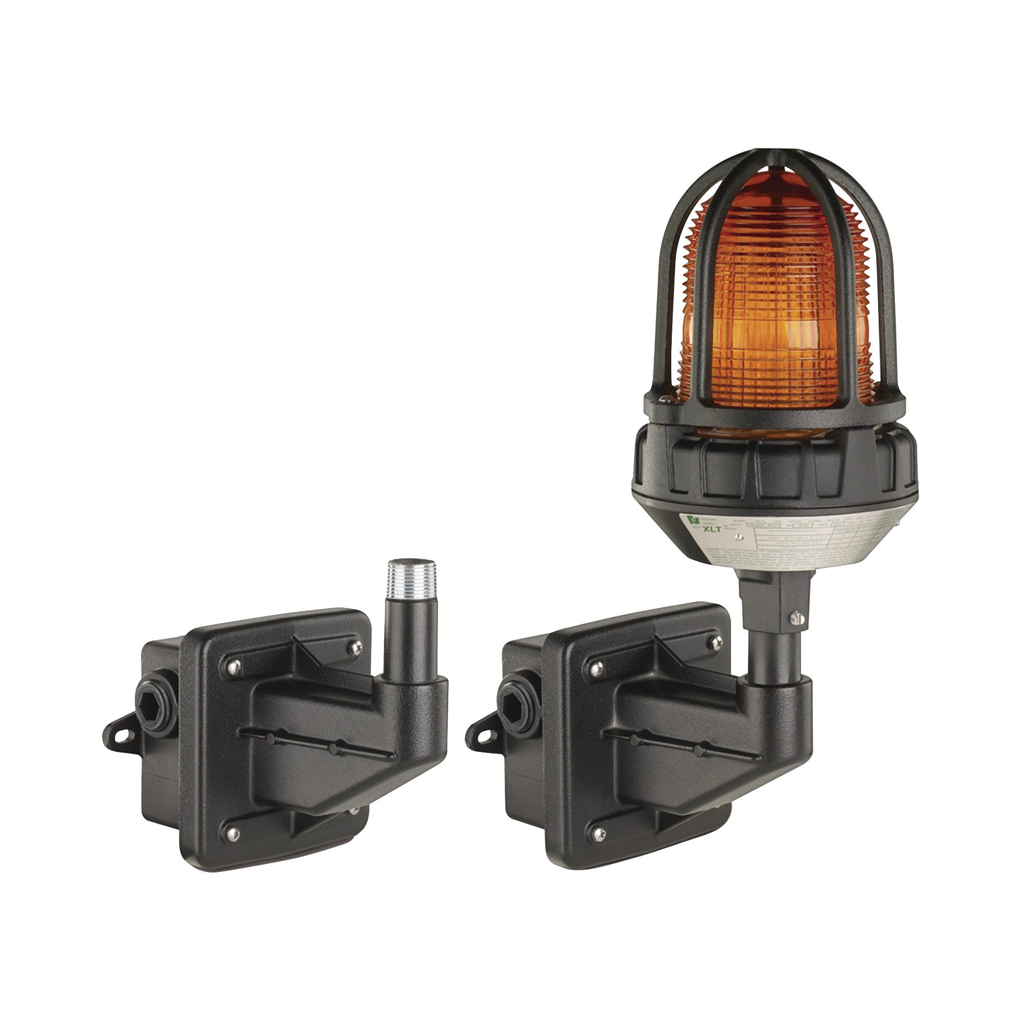 El soporte de montaje en pared para lugares peligrosos modelo LHWB está diseñado específicamente para usarse con las luces de advertencia estacionarias de Federal Signal para proporcionar un medio fácil y consistente de montar luces de forma segura en toda una instalación. El soporte cuenta con una conexión de tubería macho NPT de 3/4 de pulgada. Hay casquillos opcionales disponibles para montaje de accesorios de 1/2 pulgada y 1 pulgada.