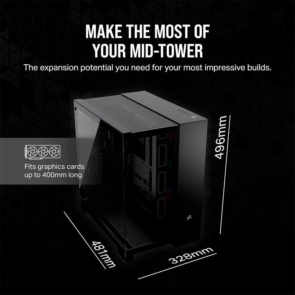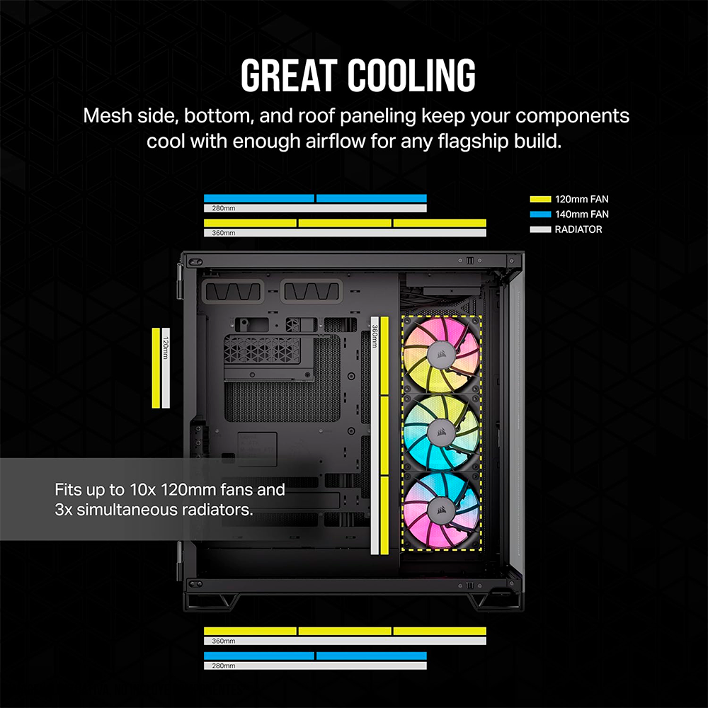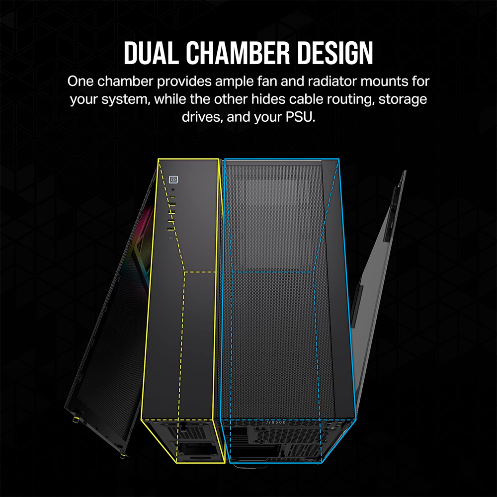 Home COMPONENTES GABINETES Gabinete Corsair 6500X RGB, Mid-Tower, Doble Cámara, Cristal Templado panorámico, Compatible con placas madre de conexión inversa, Incluye 3 Ventiladores RGB, Negro, CC-9011269-WW