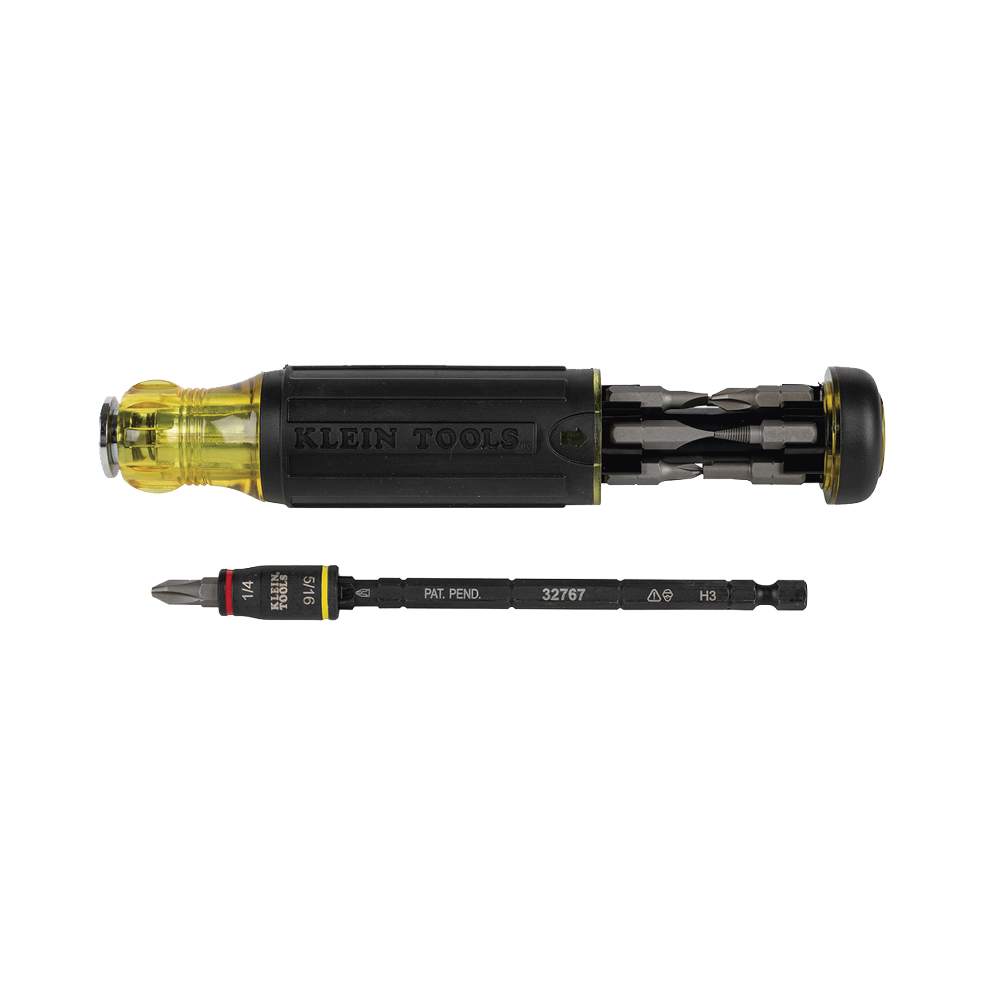 Incluye puntas Phillips n.º 0, n.º 1 y n.º 2, ranuradas de 1/8» (3,2 mm), 3/16»,(4,8 mm) y 1/4» (6,4 mm), cuadrada n.º 2, T10, T15, punta JIS n.º 2, punta para instalación de válvula Schrader® y punta para extracción de núcleo