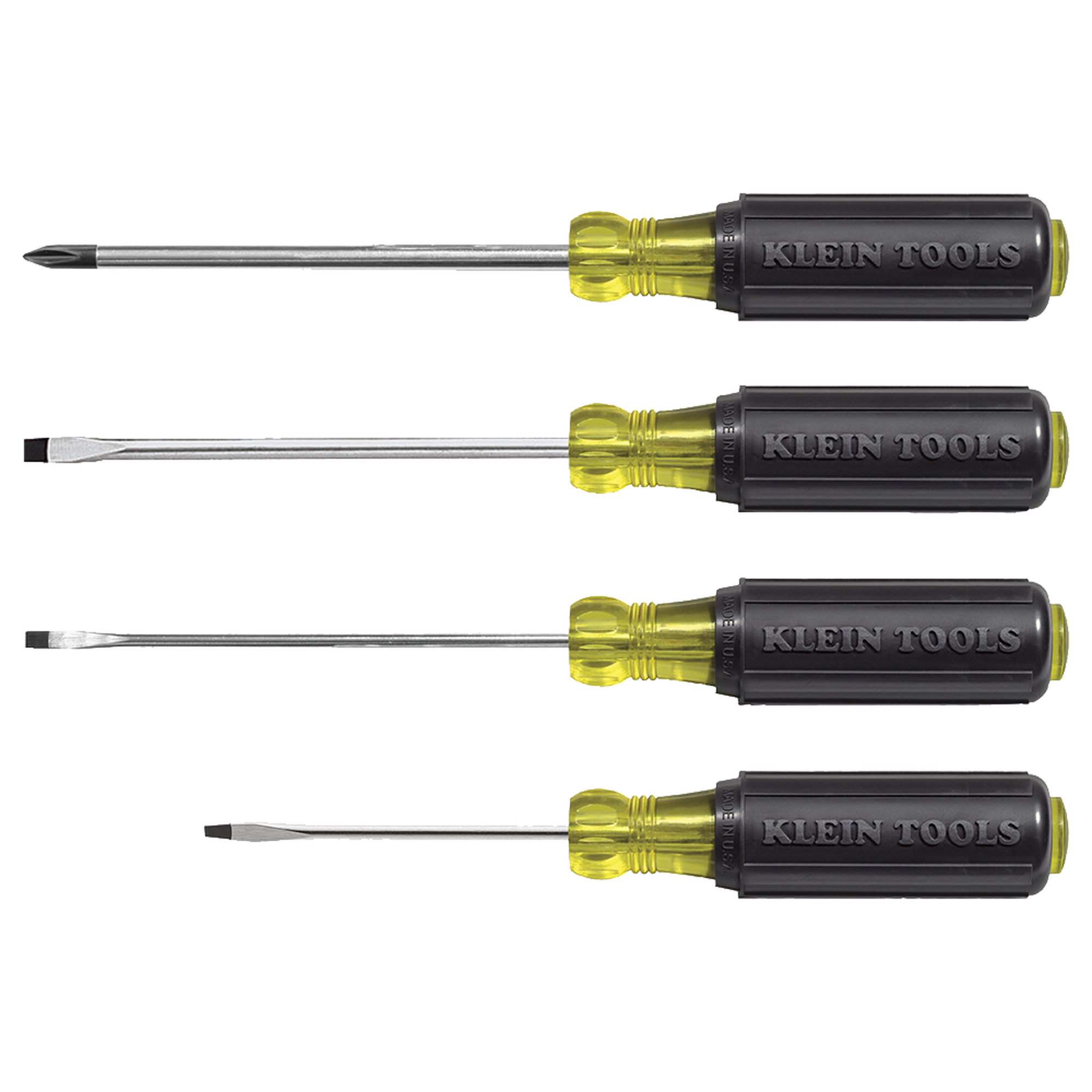 Juego de desarmadores que incluye un desarmador de punta Phillips, uno de punta plana y dos de punta cabinet