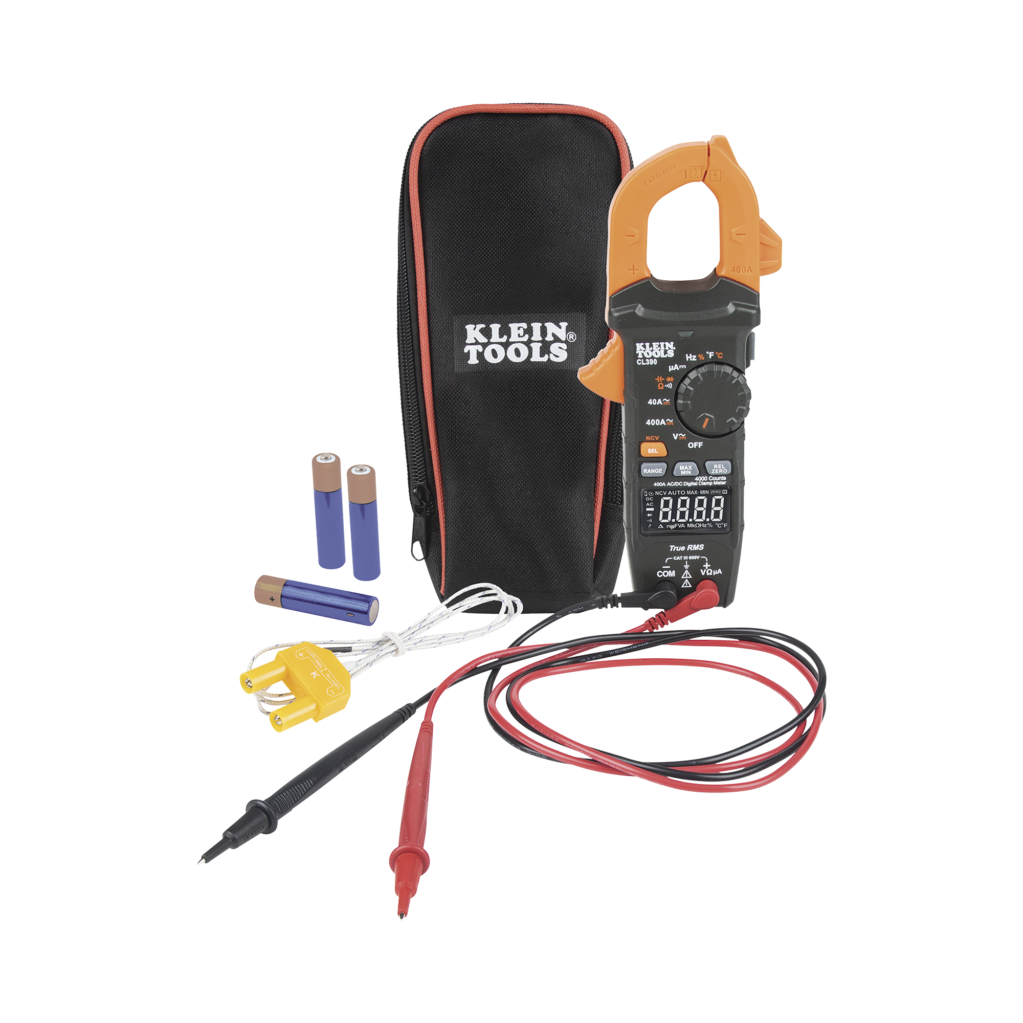 Incluye un estuche para transporte, cables de prueba con capuchones de seguridad CAT III/CAT IV, termopar, instrucciones y 3 baterías AAA.