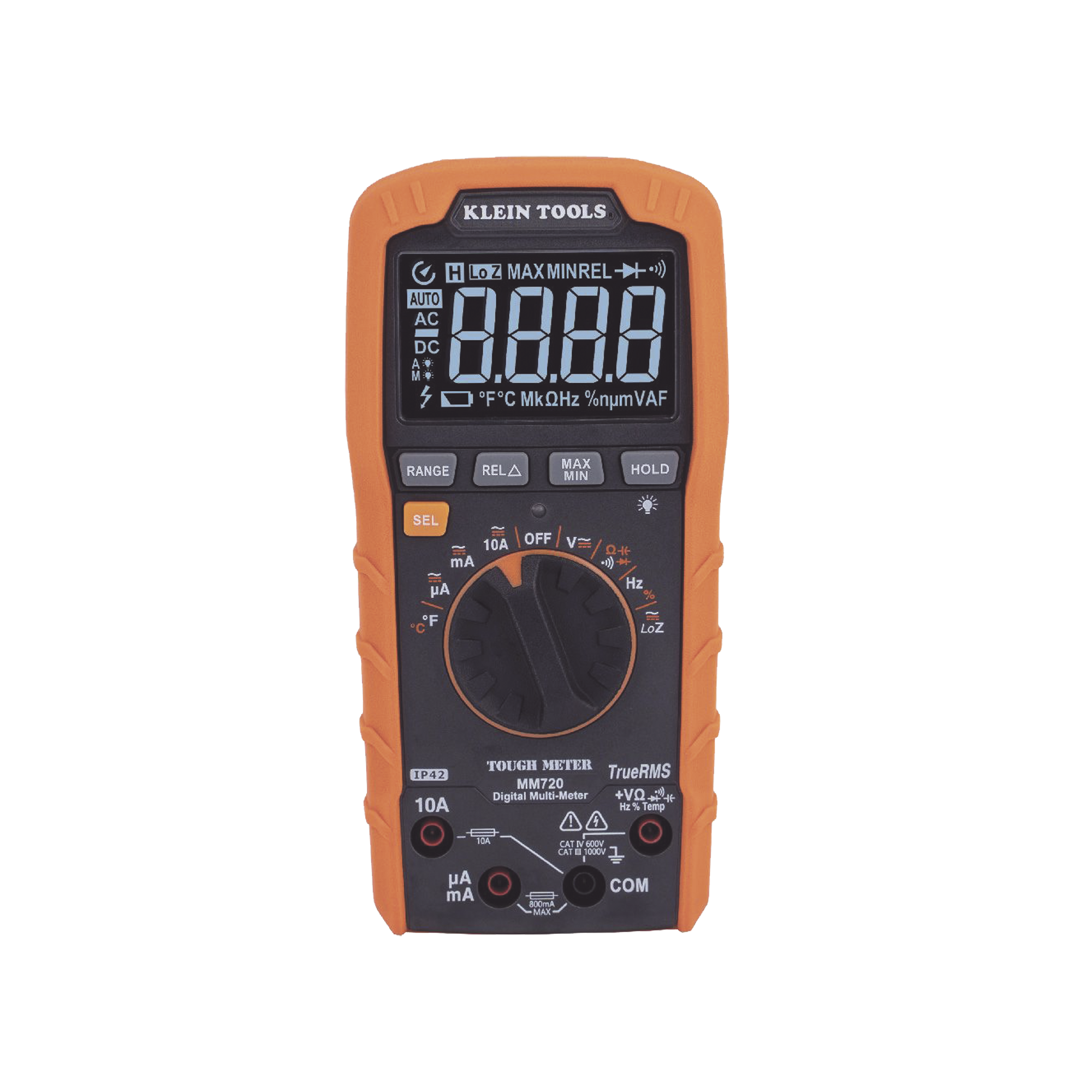 Multímetro resistente construido para resistir una caída desde 6,6′ (2 m) de altura y con clasificación IP42