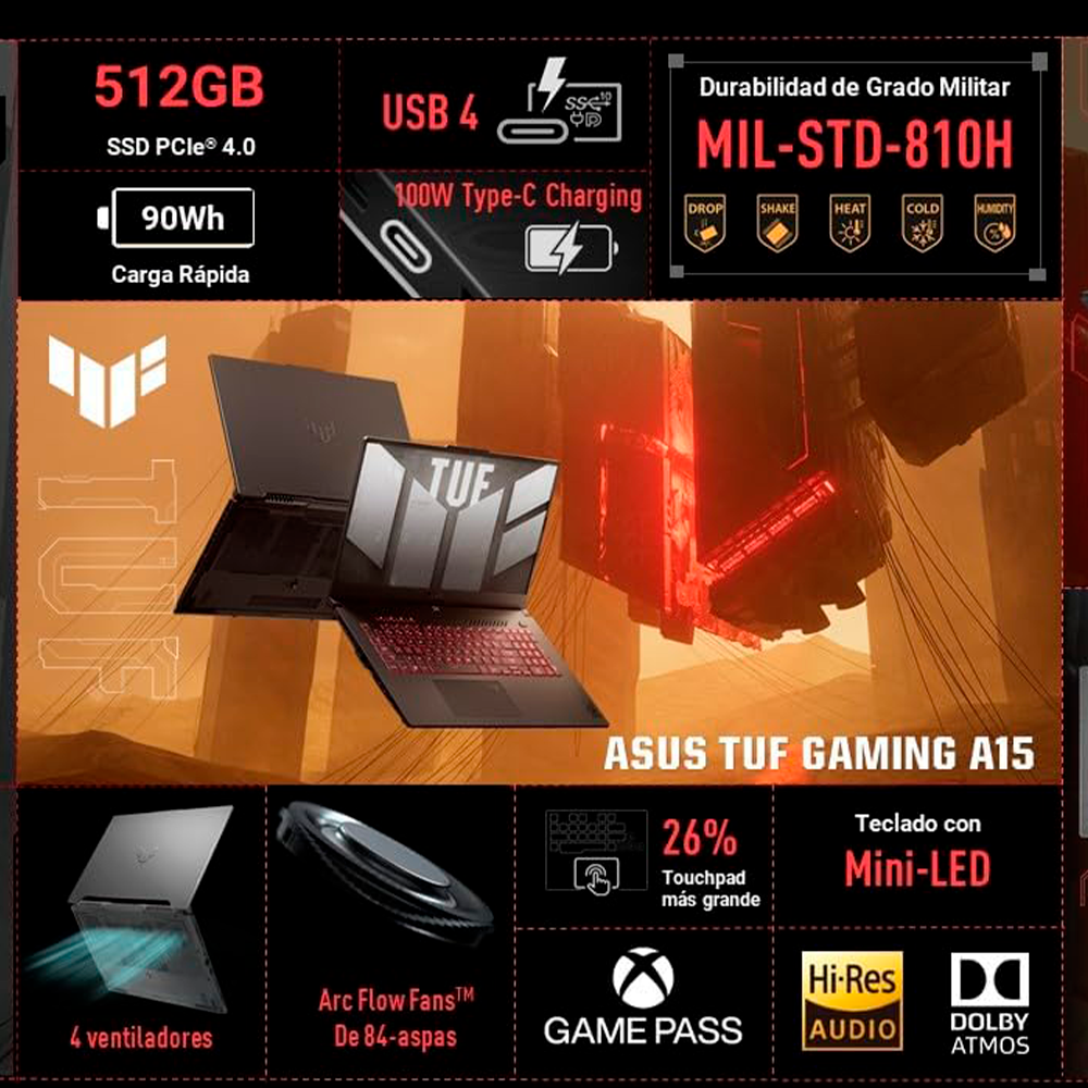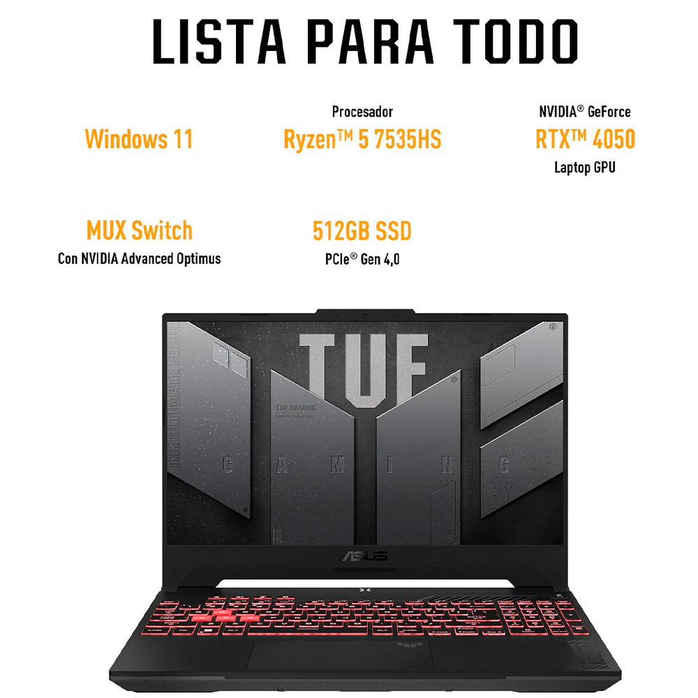 Home Computadoras PORTÁTILES Laptop Gamer ASUS Laptop TUF Gaming A15, FA507NU-LP101W, AMD Ryzen 5 7535HS, NVIDIA GeForce RTX 4050, 144Hz, 8GB RAM, 512GB SSD, Windows 11, FA507NU-LP134W