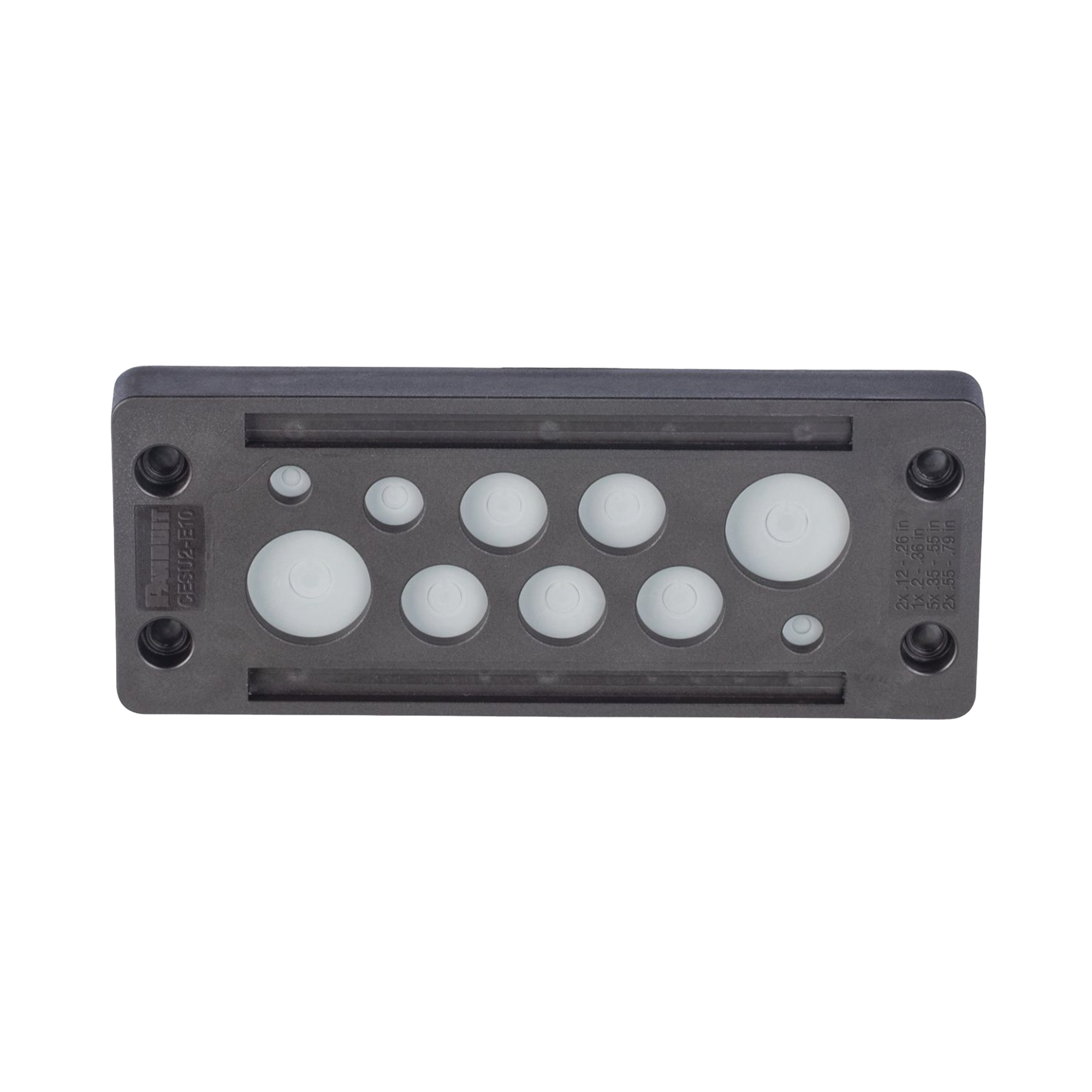 El sistema de entrada de cables de ingeniería ofrece un alto grado de alivio de tensión al tiempo que mantiene la clasificación de sellado de ingreso IP/NEMA. El CESU2-E10 es un sistema de entrada de cables rectangular sin terminación, de 5,79″ (147,1 mm) de largo, con 2 aberturas de 0,12″ (3,0 mm) a 0,26″ (6,6 mm), 1 abertura de 0,2″ (5,1 mm) a 0,36″ (9,1 mm), 5 aberturas de 0,35″ (8,9 mm) a 0,55″ (14,0 mm) y 2 aberturas de 0,55″ (14,0 mm) a 0,79″ (20,1 mm).
