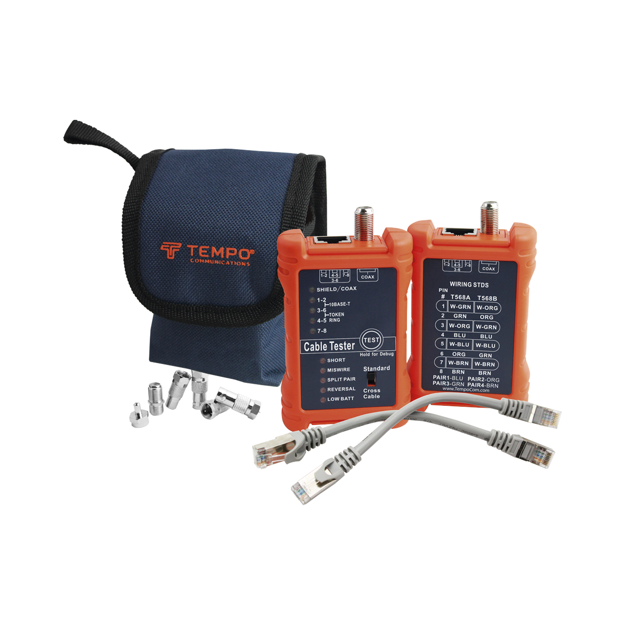 Pruebe la continuidad de los cables de conexión coaxiales y LAN de 8 hilos (RJ45) y los tramos de cables instalados con el Tester PA1594 de Tempo. El PA1594 mapea el cable, línea por línea e identifica buenas conexiones, aperturas, cortocircuitos, divisiones y cruces.
