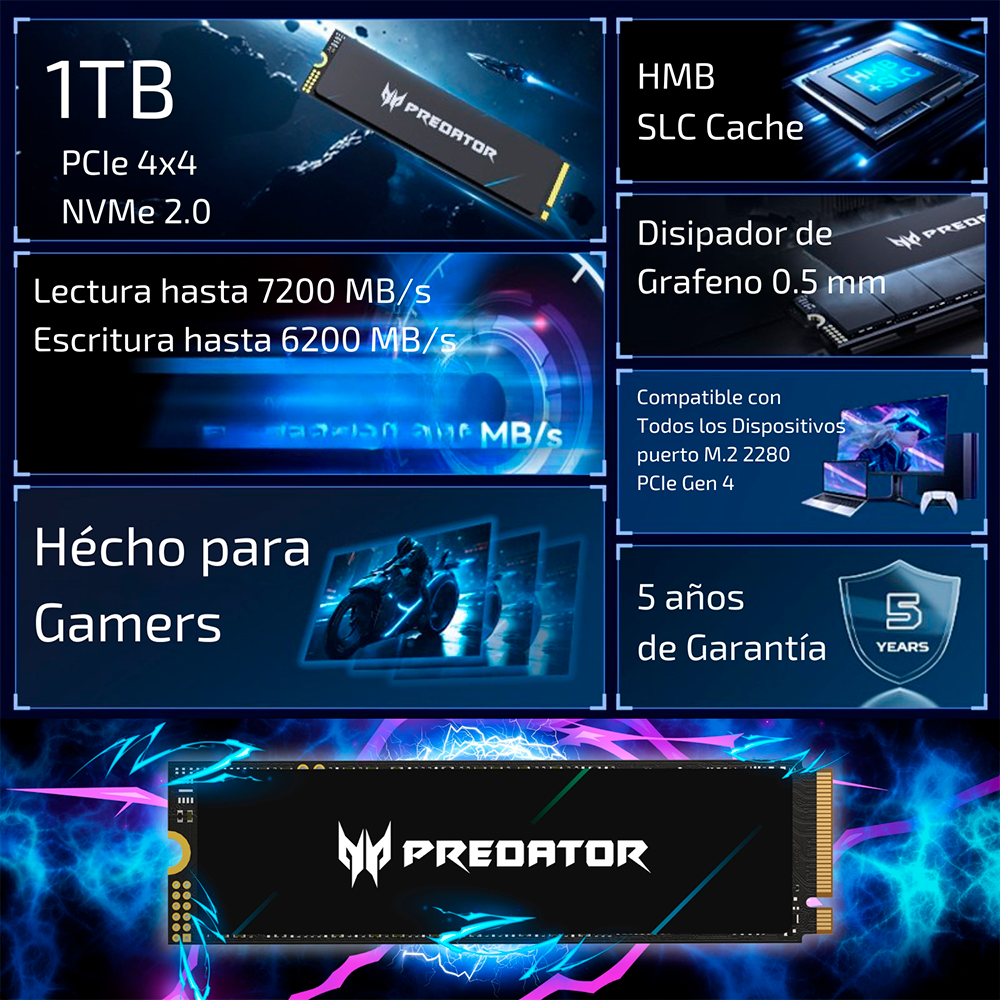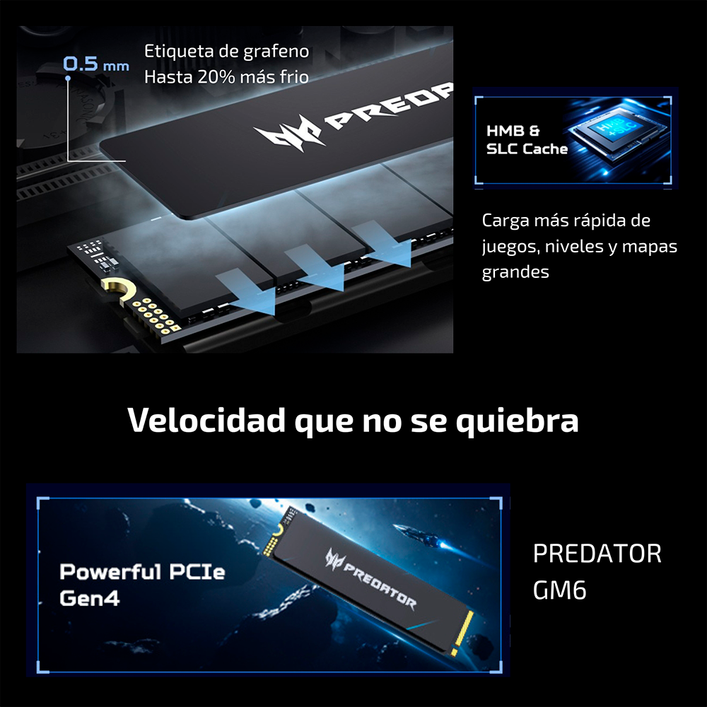 Home COMPONENTES UNIDADES SSD Unidad de Estado Sólido SSD Acer Predator GM6 NVMe, 1TB, M.2, 6200 MB/s Escritura, 7200 MB/s Lectura, PCI Express 4.0, BL.9BWWR.133 /MAX. 1 X CLIENTE